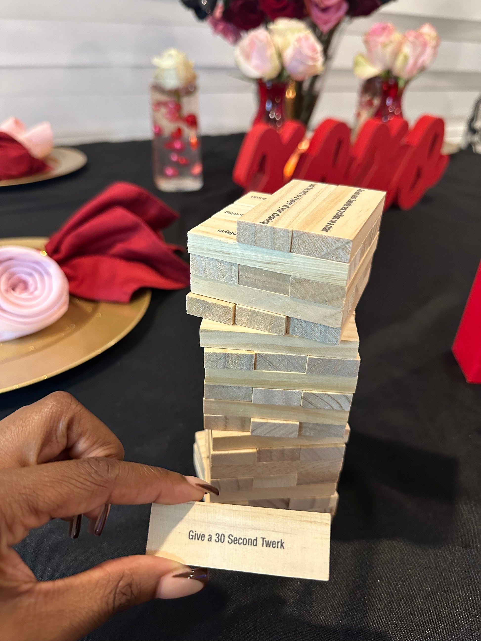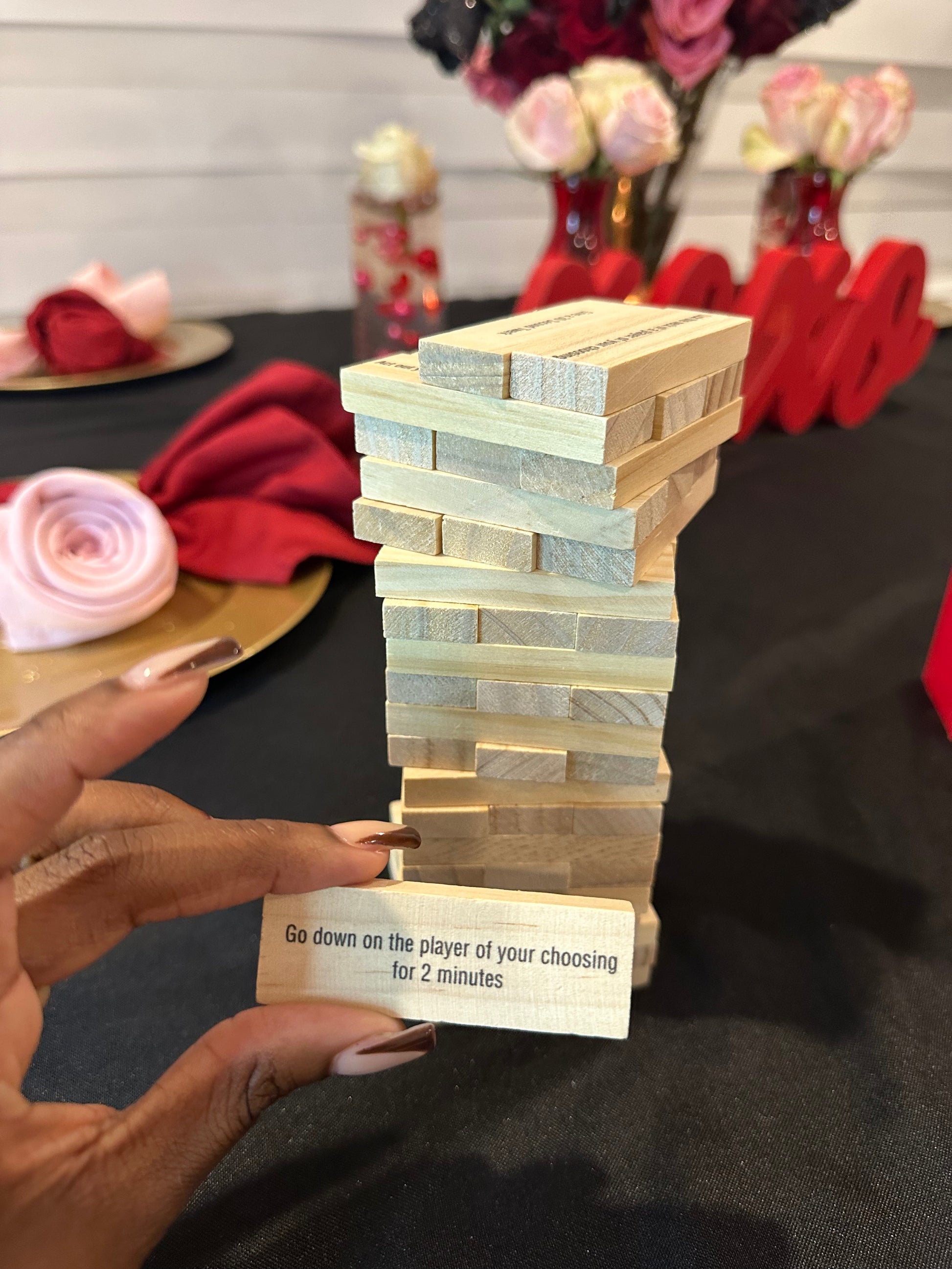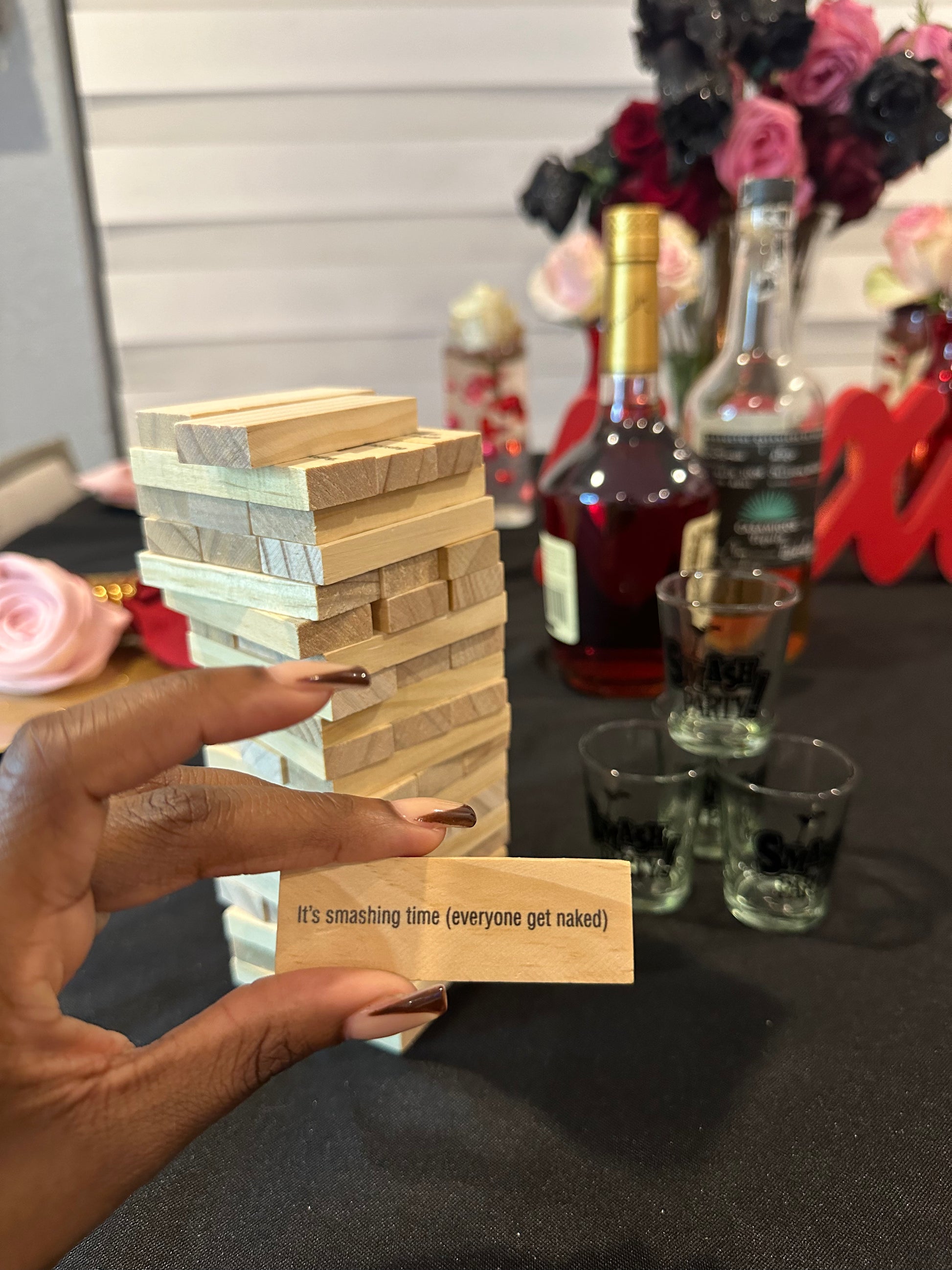 Once all the pieces are stacked up to a tower (three horizontal, three vertical, remember), players will take turns carefully removing one block at a time. Once they've pulled their block, they can follow the very playful instructions (let another player give you a hickey, motorboat a player of choice, kiss a player of choice etc.) or take a drink. Four Smash Party shot glasses are included, just to make things easy!